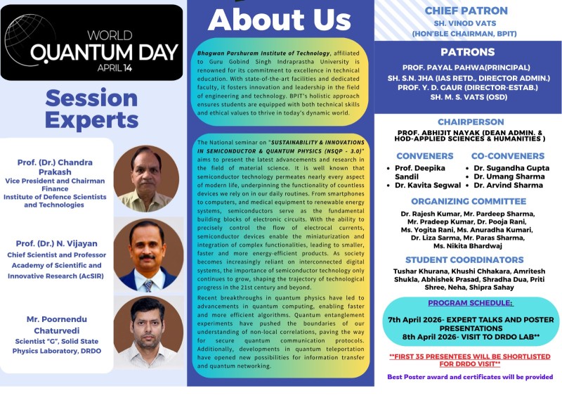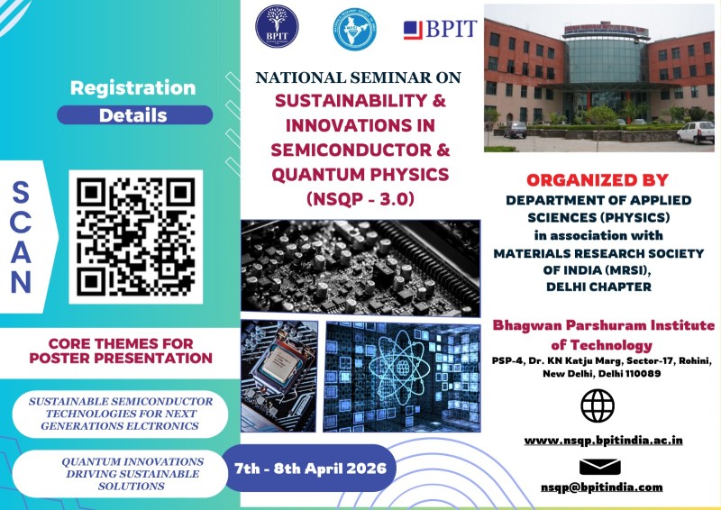 Following the resounding success of the inaugural National Seminar on Innovations in the Field of Semiconductor & Quantum Physics (NSQP – 2024) held on 6th March 2024, BPIT proudly hosted the second edition—NSQP 2.0 on 8th April, 2025. The first edition saw the convergence of over 130 participants and expert speakers who shed light on cutting-edge developments in quantum and semiconductor physics, laying a strong foundation for future scholarly discourse.